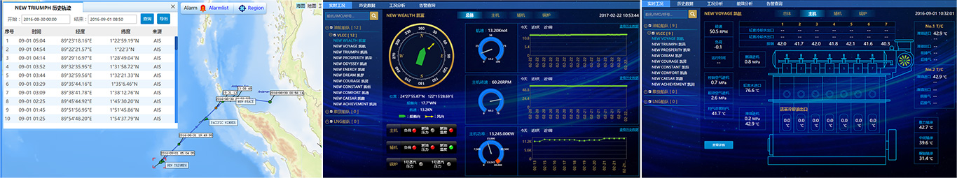 船隊(duì)運(yùn)營管理可視化平臺(tái),該平臺(tái)的是以海圖為基礎(chǔ)平臺(tái),可以單船、同型號(hào)姊妹船舶、同噸位不同型號(hào)船、船隊(duì)等為經(jīng)營 管理的核算單位,將船舶位置跟蹤、位置監(jiān)控、視頻監(jiān)控、船舶安全、氣象服務(wù)等航海信息服務(wù)與經(jīng)營生產(chǎn)數(shù)據(jù)信息集成整合, 提供船舶工況監(jiān)控和生產(chǎn)數(shù)據(jù)分析,是服務(wù)于船舶安全管理和生產(chǎn)運(yùn)營的一體化可視平臺(tái)。